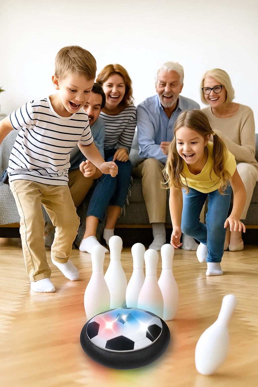 لعبة مبتكرة بتجري وتنزلق بسهولة على أي سطح ناعم زي السيراميك أو الباركيه، ومعاها مجسمات بولينج صغيرة علشان يلعبوا ويتسلّوا في البيت بأمان.