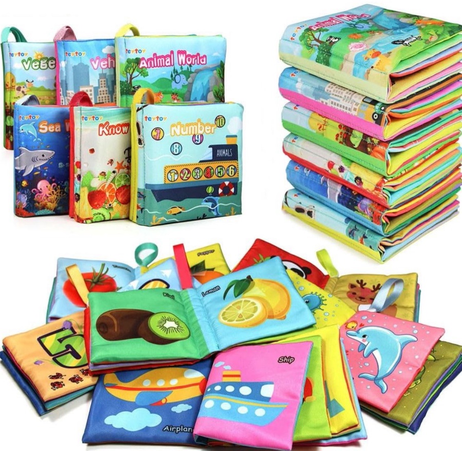 اكتشفي كتاب قماش للأطفال آمن وناعم، مليان ألوان ورسومات ممتعة عن الأرقام والحيوانات والخضار، مثالي لتنمية حواس طفلك من الشهور الأولى.